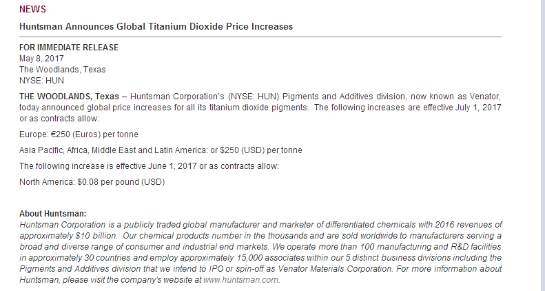 国际钛白粉巨头亨斯曼宣布涨价